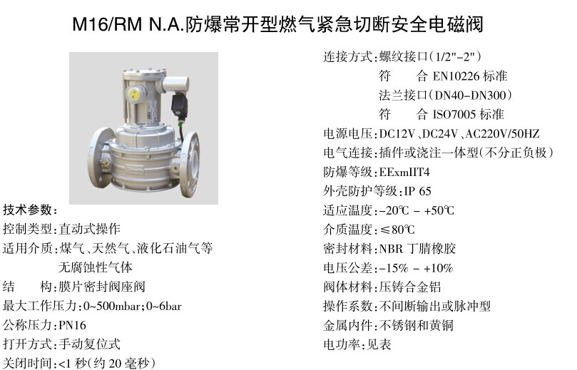M16/RM N.A.防爆常开型燃气紧急切断安全电磁阀