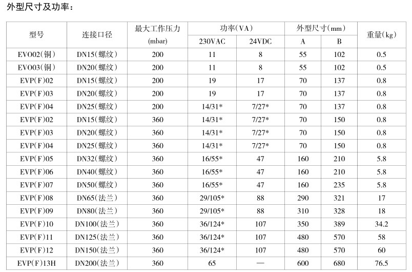 EV003(铜)DN15螺纹 EV003(铜)DN20螺纹 EVP(F)02 DN15螺纹 EVP(F)03 DN20螺纹 EVP(F)04 DN25螺纹 EVP(F)02 DN15螺纹 EVP(F)03 DN20螺纹 EVP(F)04 DN25螺纹 EVP(F)05 DN32螺纹 EVP(F)06 DN40螺纹 EVP(F)07 DN50螺纹
