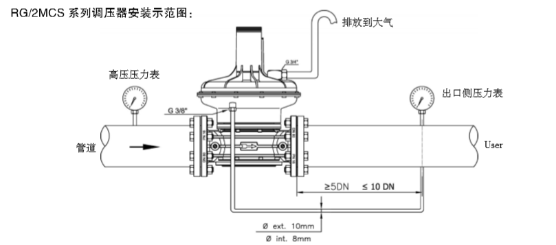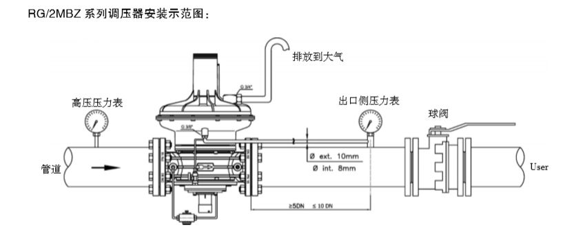 例如:所需出口压力为20mbar,超压切断压力为40mbar,放散压力为30mbar,欠压切断压力为10mbar。