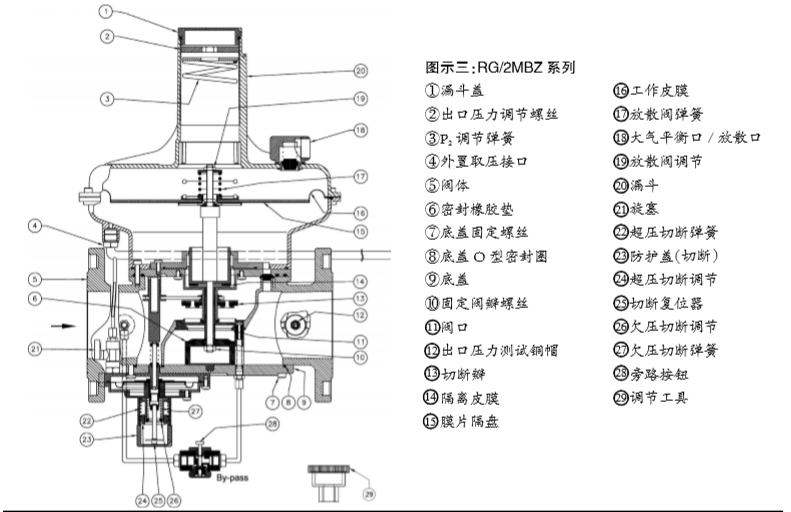 压力为40mbar,拧调节螺丝②为超压压力,拉动复位杆①;重新用调节螺丝②将出口压力调节到30mbar,