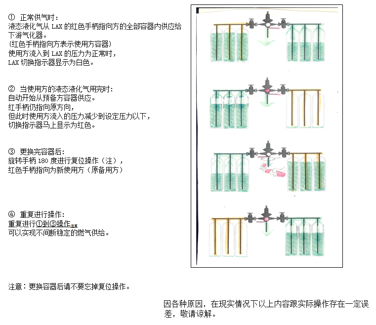 LAX系列是把液态液化气供给下游气化器,避免使用中突然停止燃气供应(断气),保证安全并且不间断稳定地供给的一种装置。