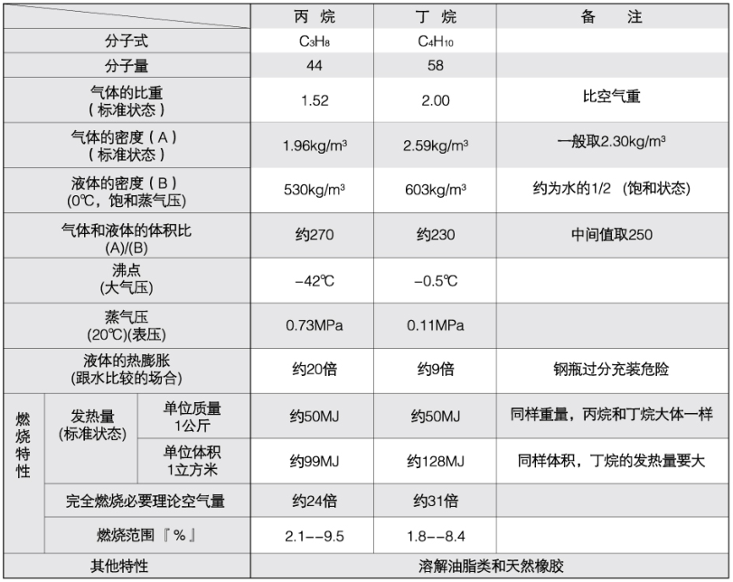 国内液化石油气组成主要成分是丙烷和丁烷组成,还有很少部分的C5/C6高碳烷烃类成分,如上表所示丙烷和丁烷性质,高碳组分在常温下是液体状态。